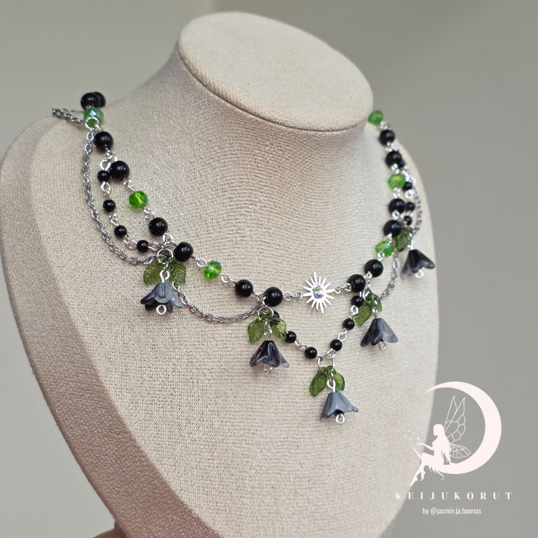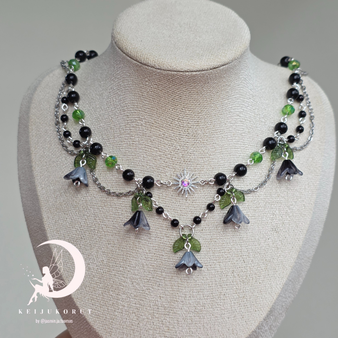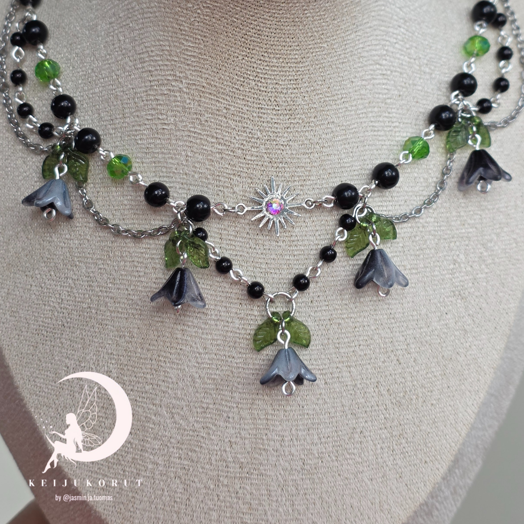 Dark forest inspired baroque style choker necklace with hanging black glass flower pendants and stainless steel sun pendant. The chain is made up of black and pearl glass beads.