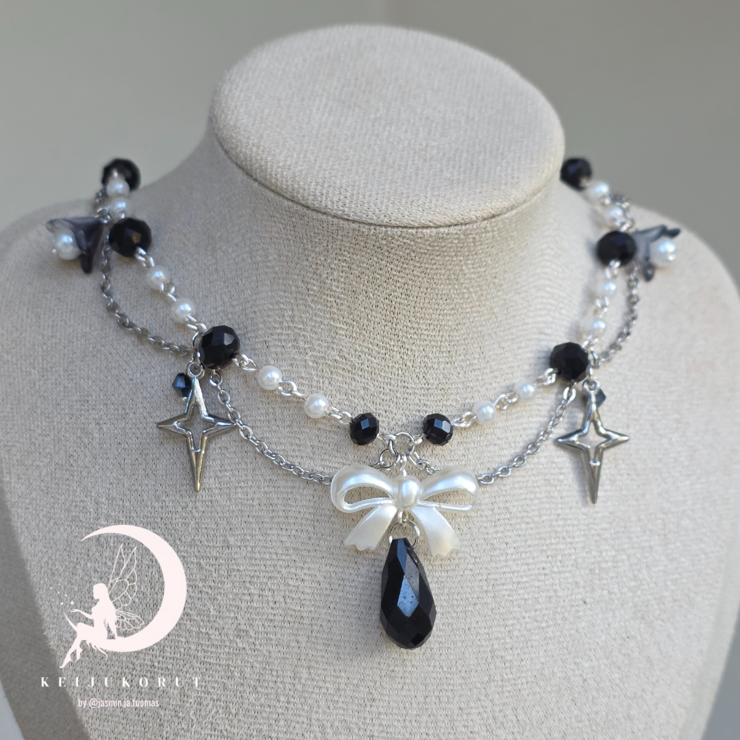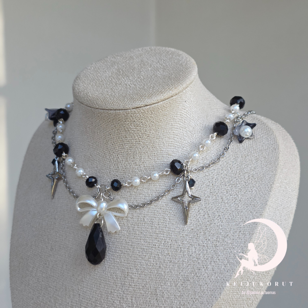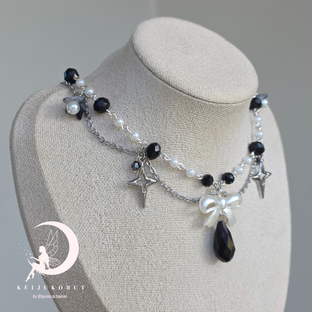 Y2k influenced baroque style choker necklace with hanging black glass pendant and stainless steel star pendants. The chain is made up of black and pearl glass beads.